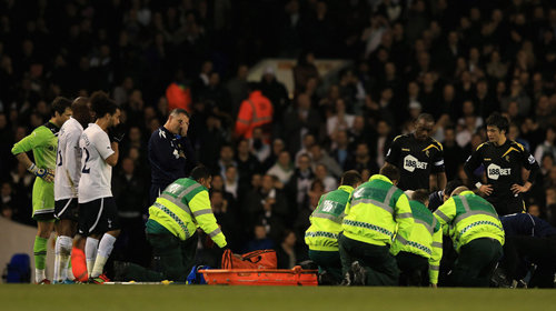 Các bác sĩ đang chăm sóc tại sân bóng cho cầu thủ Fabrice Muamba (Nguồn: Getty Images và Báo thanh niên)